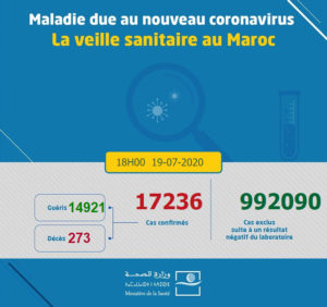 Ce nouveau bilan porte à 17.236 le nombre de contaminations dans le Royaume depuis le premier cas signalé le 2 mars dernier et à 14.921 le nombre des personnes totalement rétablies, soit un taux de guérison de 86,6%. Le nombre des morts s’est établit à 273 avec 4 nouveaux décès ayant été enregistrés aux dernières 24h, soit un taux de létalité de 1,6%.