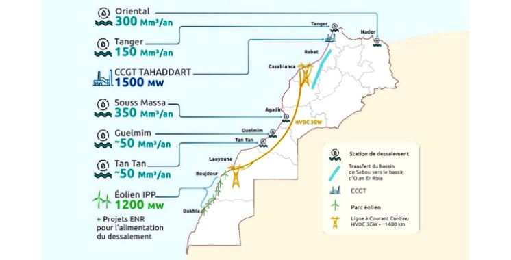 La même source précise que ce partenariat permettra tout d’abord «le renforcement de la sécurité hydrique avec une capacité additionnelle de dessalement cible de 900 millions de m3 d’eau dessalée ainsi que 800 millions de m3 de transport d’eau à travers le projet d’autoroute de l’eau. Ces stations de dessalement seront alimentées par de l’énergie verte qui sera développée par Taqa Morocco et ses partenaires ainsi que la reprise de la centrale à gaz de 400 MW à Tahaddart et l’extension de près de 1.100 MW de projets CCGT additionnels.