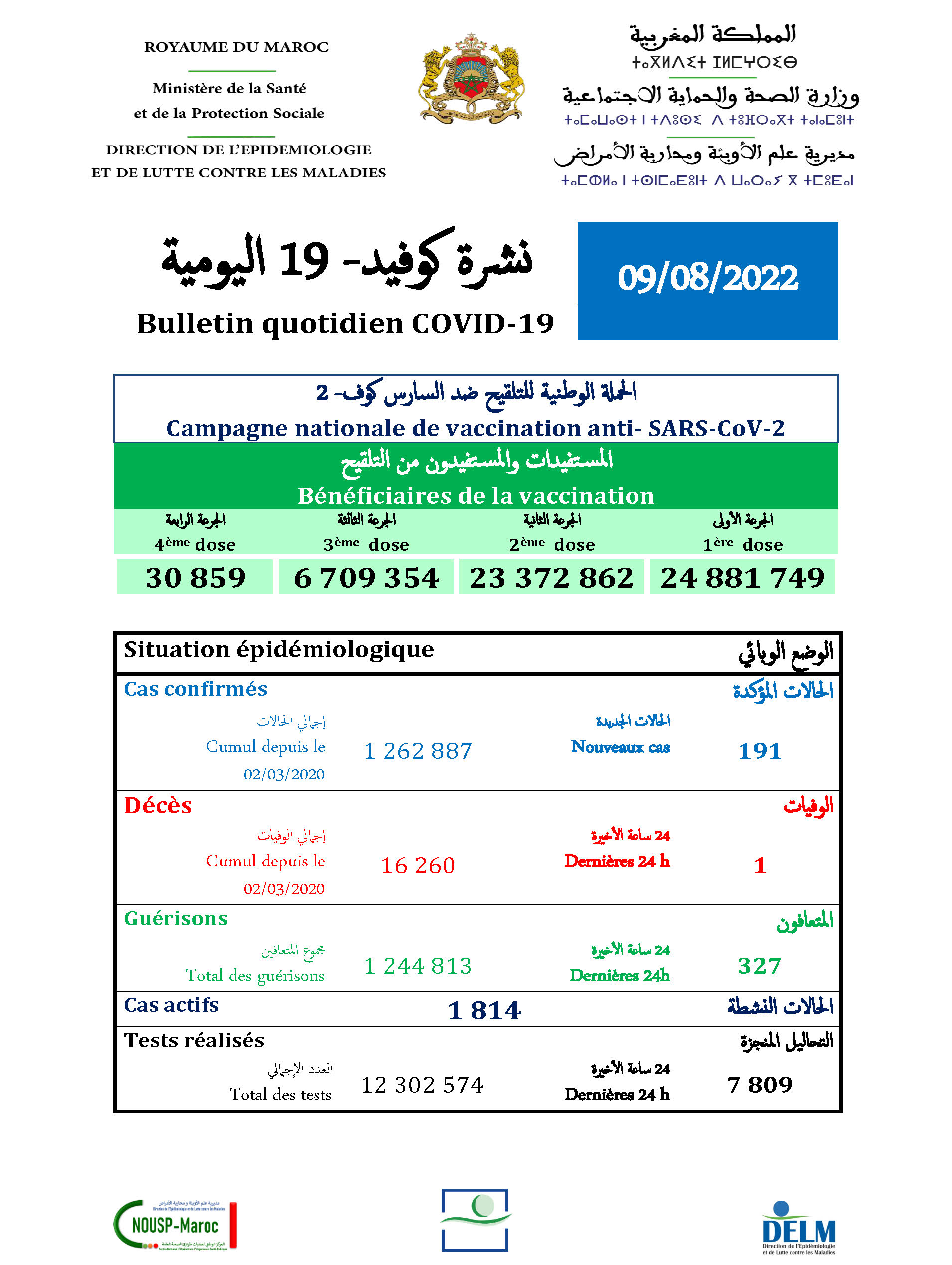 191 nouveaux cas soit un cumul de 1.262.887 cas à ce jour.
